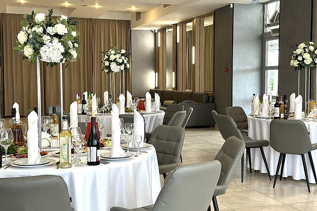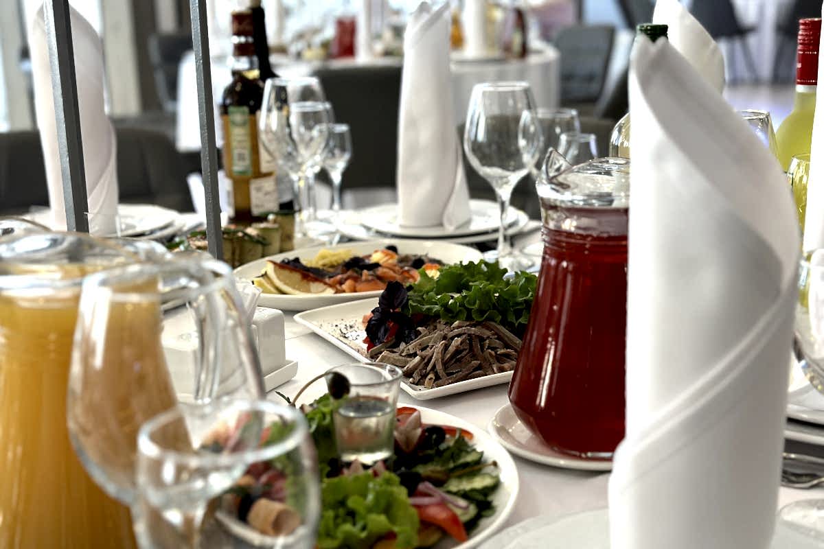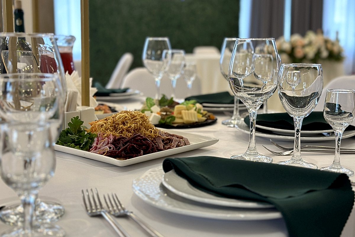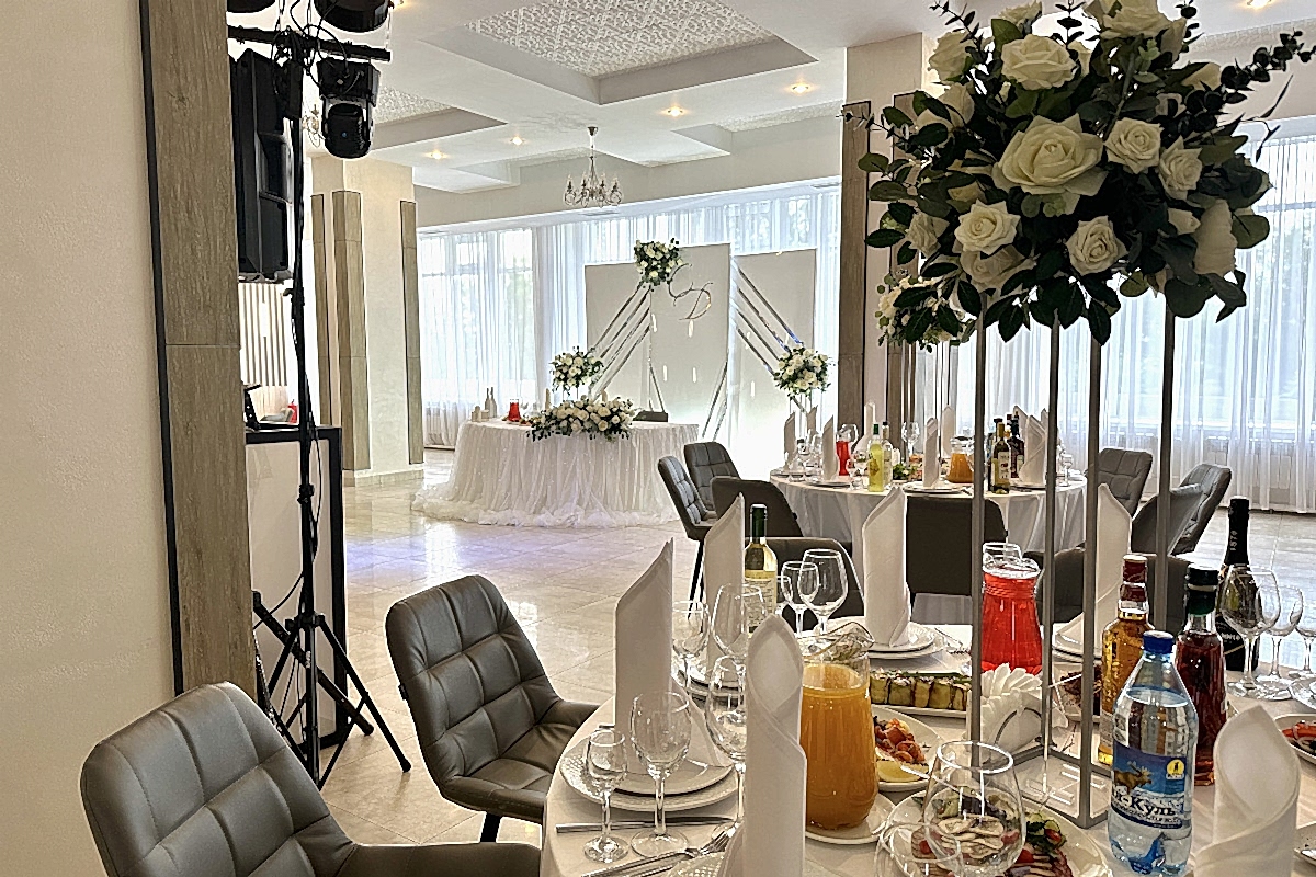 Просторный зал с Пин-ап на Абаканскую протоку создаст идеальную атмосферу элегантности и красоты, а уютное освещение, белоснежные скатерти и изысканная мебель позволит погрузиться в ощущение праздника.