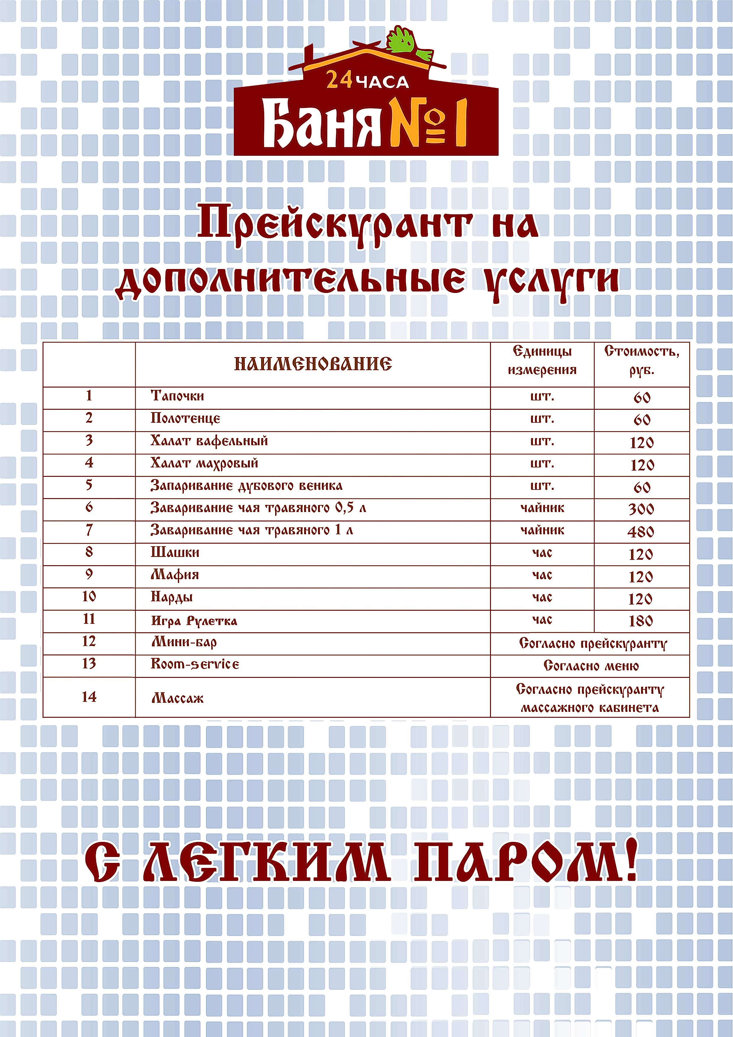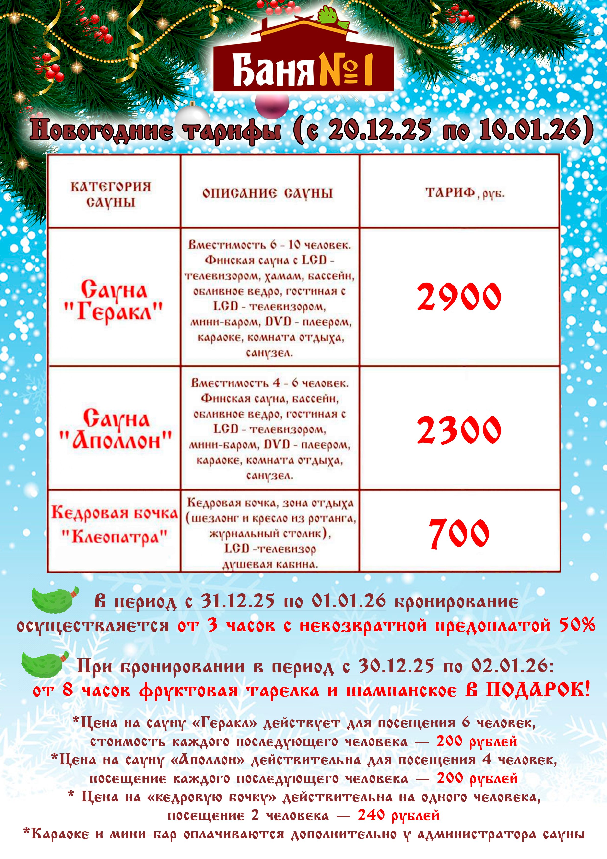 ПрейскурантПрейскурант (20.12.25 - 10.01.26)Дополнительные услугиВ