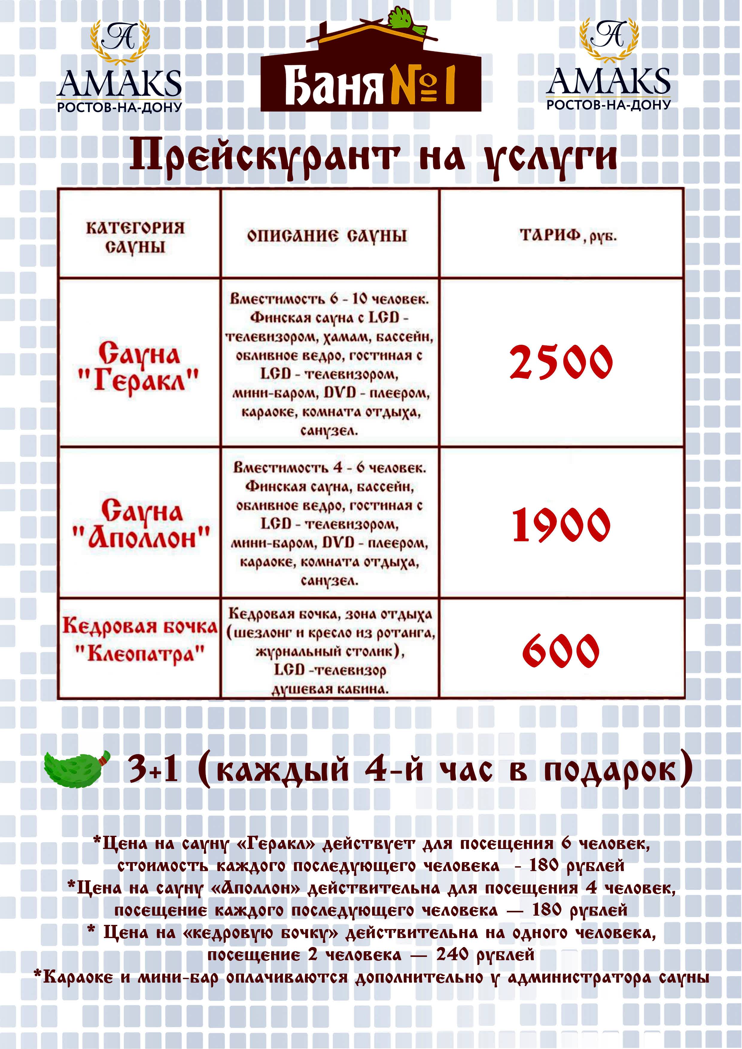 *, бассейн (3.5 х 3 м, глубиной 150 см) с подсветкой, 2 обливных ведра и 2 душа. Гостевая комната с LCD телевизором, караоке, телефоном для заказа еды и напитков, обеденным столом, диванами и журнальным столиком. Комната отдыха с двуспальной кроватью и санузлом, оборудованный раковиной, унитазом, феном. Максимальная вместимость сауны «Геракл» 10 человек. Базовый тариф рассчитан на 6 человек, за каждого последующего гостя взимается дополнительная оплата 200₸ в час